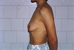 In acest caz, s-a optat pentru o interventie de ridicare a sanilor cu ajutorul unor implante mamare cu forma rotunda si profil inalt (300cc), introduse retroglandular, prin abord periareolar.